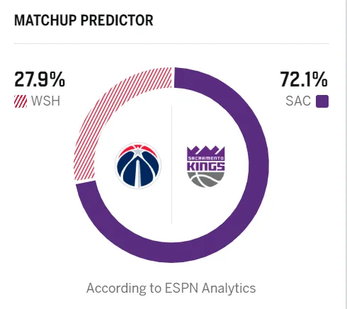 赛前,美媒ESPN预测本场比赛,国王胜率72.1%,奇才胜率27.9%。