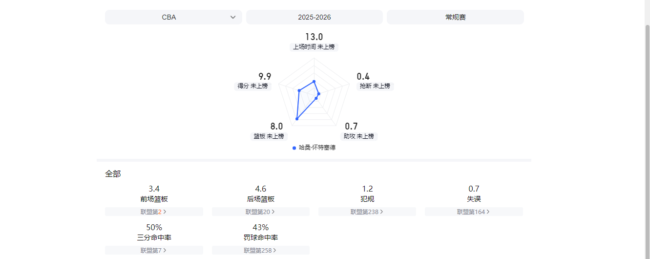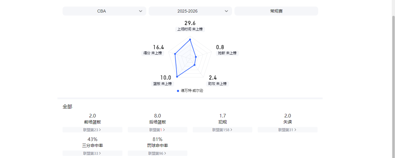 另外,他也是一名出色的全能空间型四号位,第一阶段场均可得到16.4分10篮板2.4助攻1.4盖帽,三分命中率高达43%。