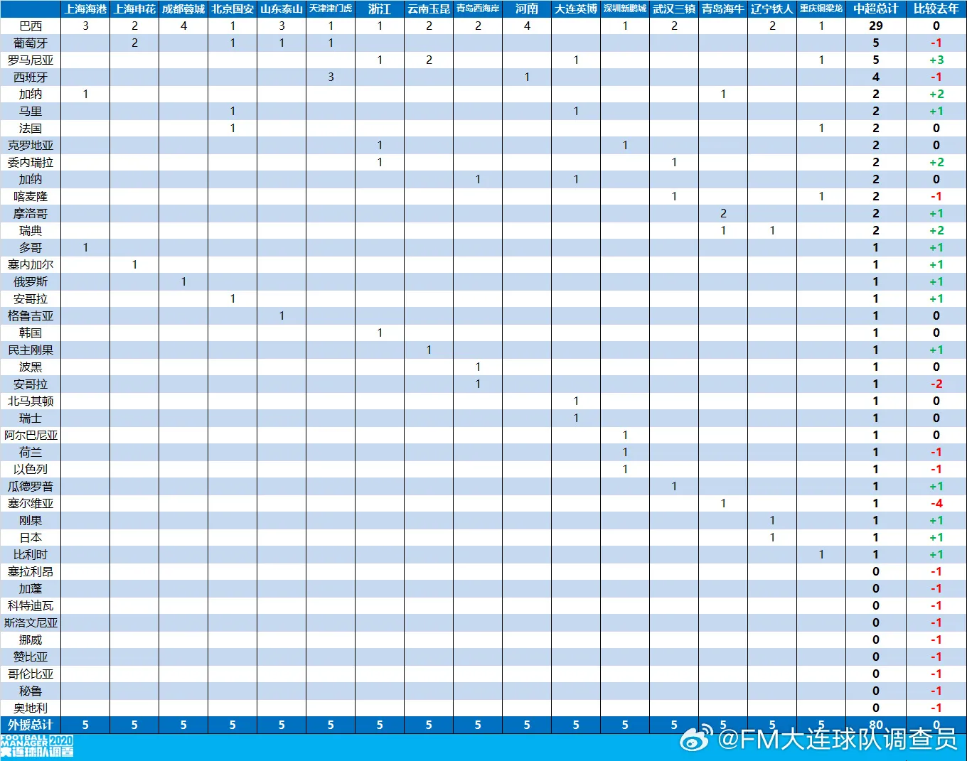 虎扑03月05日讯 从最新统计的中超各队球员来源分布来看,联赛目前共有外援80人、国内球员428人。外援方面,巴西球员仍然占据绝对主导地位,共有29人分布在各队,其次是葡萄牙、罗马尼亚等国家。国内球员来源则呈现明显的地域集中趋势,其中山东省以54人位居第一,辽宁省53人紧随其后,河南、湖北、江苏等省份也保持较高的人才输出,整体反映出中超球员培养与地域足球基础之间的紧密联系。